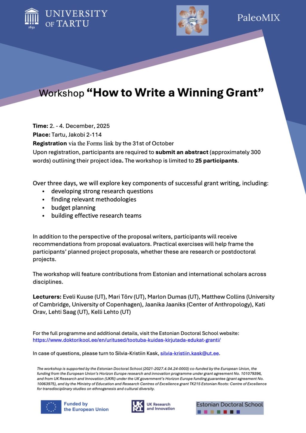 Welcome to participate in Estonian Doctoral School workshop and finetune your project proposal writing skills under experienced evaluators and scholars across disciplines. Please register by 31st of October via the forms link . The workshop will take place in Tartu over three days at the beginning of December. For the full programme and additional details,…